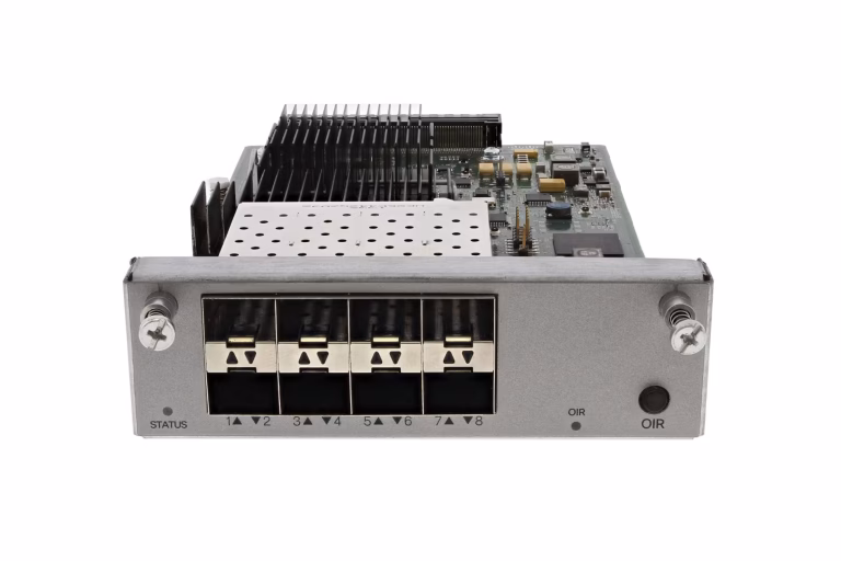 ماژول C4KX-NM-8SFP 🔌 برای افزایش ظرفیت ارتباطی سوئیچهای 4500-X طراحی شده و با اضافهکردن ۸ پورت SFP امکان اتصال فیبر نوری با سرعت ۱Gbps را فراهم میسازد.